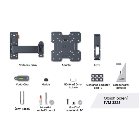 TVM 3223 se snadno instaluje. Společnost Vogel's vám to usnadňuje ve všech ohledech. Součástí balení je vrtací šablona, šrouby, hmoždinky Fischer® DuoPower, vázací páska na kabel a vodováha. K vyznačení prvního vrtaného otvoru použijte naši bezplatnou aplikaci DrillRight™ AR. Stručný návod k instalaci naleznete ve v balení, podrobný návod a instalační video jsou k dispozici online.