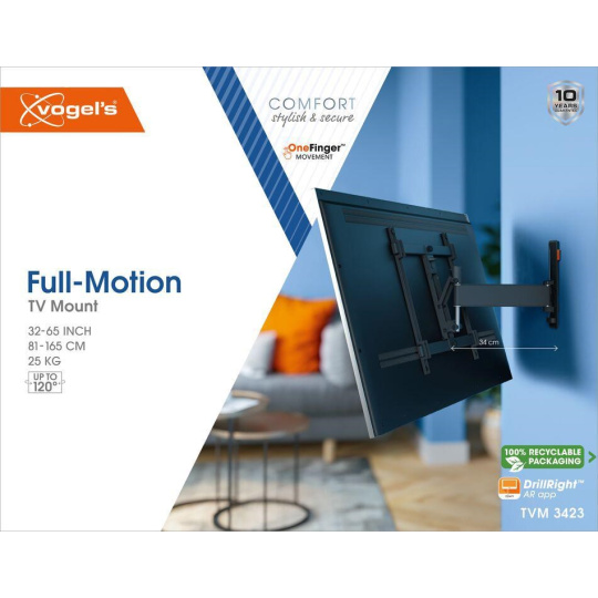 Společnost Vogel's vám instalaci držáku co nejvíce usnadní. Balení obsahuje vrtací šablonu, šrouby, hmoždinky Fischer® DuoPower, stahovací pásky na kabely a vodováhu. Pomocí naší bezplatné aplikace DrillRight™ AR App si snadno vyznačíte první vrtací otvor a pokyny k montáži najdete ve stručném průvodci instalací. Nebo si prohlédněte podrobný návod či speciální instalační video online. S držákem TVM 3423 je zaručena bezpečná montáž televizoru. Každý držák je certifikován TÜV a testován na trojnásobek své maximální hmotnosti. Ne nadarmo se na nástěnný držák televizoru COMFORT Full-Motion vztahuje desetiletá záruka.
