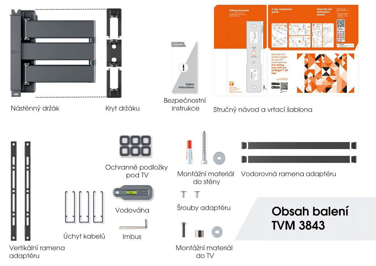 Pro bezpečné naklonění televizoru je nástěnný držák vybaven systémem TiltAnchor™, kterým můžete uzamknout naklánění TV. Měkké podložky na nástěnném držáku chrání zadní stranu televizoru před poškrábáním během jeho montáže. TVM 3843 se snadno instaluje. Součástí balení je vrtací šablona, šrouby, hmoždinky Fischer® DuoPower, stahovací pásky na kabely a vodováha. Jednoduše si vyznačte první vrtací otvor pomocí naší bezplatné aplikace DrillRight™ AR. Je váš televizor mírně nakřivo? Žádný problém. Můžete jej snadno vyrovnat, a to i po instalaci.