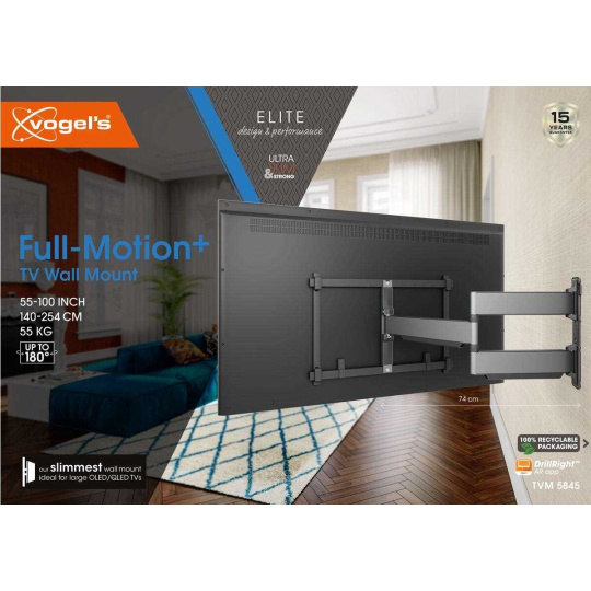Nástěnný držák ELITE Forward Motion TV je speciální, mimořádně pevný nástěnný držák vhodný pro televizory s úhlopříčkou 55 až 100 palců a hmotností až 75 kg - ideální pro velké televizory OLED nebo QLED. ELITE Forward Motion se otáčí až o 120°, takže můžete televizor sledovat prakticky v jakémkoli úhlu. Držák na stěnu je nejen velmi pevný, ale také velmi tenký, takže mezi televizorem a stěnou zůstává pouze 4,5 cm.