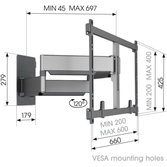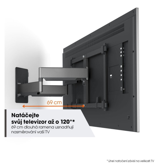 - odtažení TV od stěny na 69,7 cm, natáčení do stran 120° (maximální úhel natočení závisí na šířce konkrétní TV)