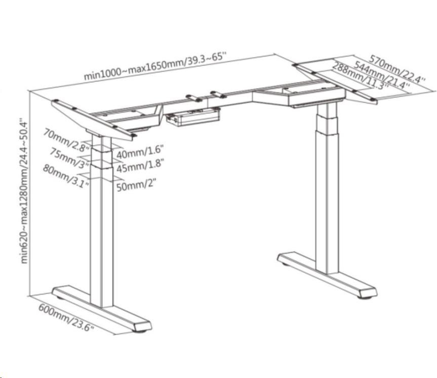 Výškově stavitelný stůl Brateck M08-23DE 2 motory rozsah 620-1280 mm nosnost 100 kg