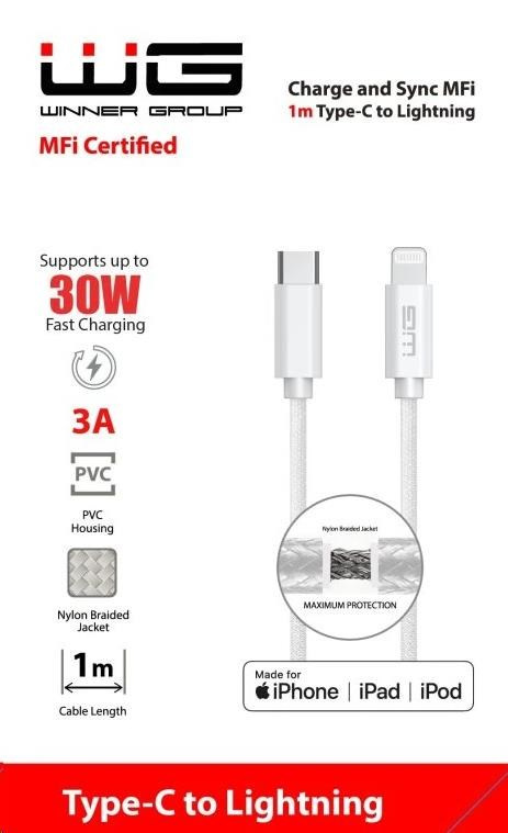 Prémiový kabel WG s certifikací MFi (Made for iPhone/iPad/iPod) je zárukou 100% kompatibility a bezpečnosti pro všechna zařízení Apple. Díky podpoře výkonu až 30 W umožňuje rychlé nabíjení iPhone, iPadu a iPodu a současně rychlý přenos dat bez zbytečného čekání.