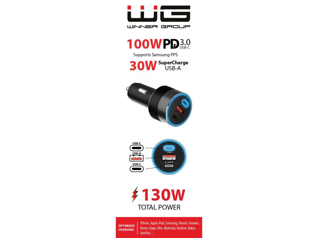 WG - Nabíječka do auta 3x USB 130W, 1x USB-C PD 100W + 1x USB-C 30W + 1x USB-A 18W, černá
