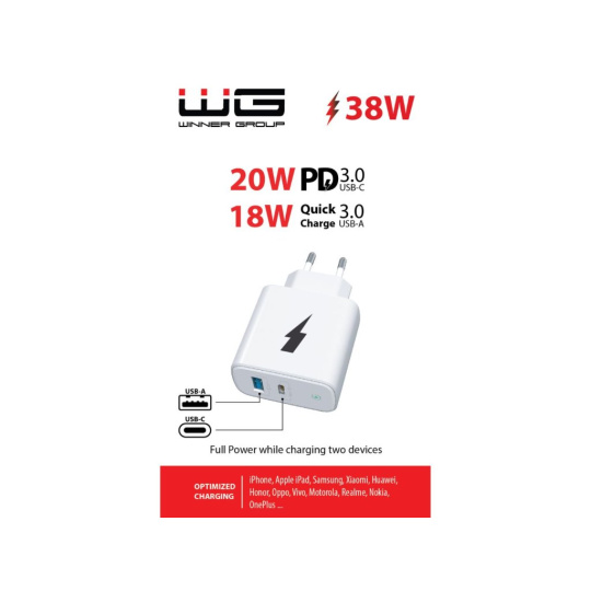 WG - Síťová nabíječka 2x USB 38W, 1x USB-C PD 20W + 1x USB-A QC 3.0 18W, bílá