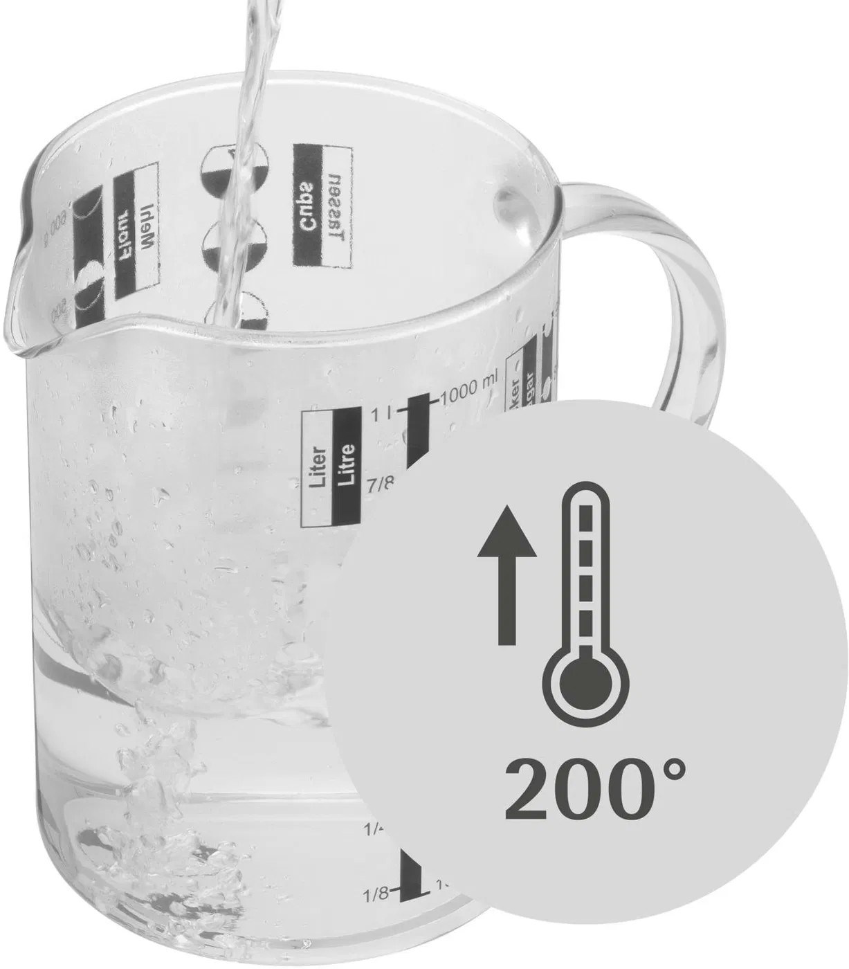 • Tepelně odolné sklo: Vyrobeno z vysoce kvalitního skla, které odolává vysokým teplotám, což umožňuje odměřování horkých tekutin přímo z hrnce.