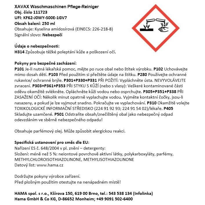 - odstraňuje nečistoty a nepříjemný zápach způsobený zbytky vodního kamene a pracích prostředků - nepříjemný zápach a usazeniny vznikají především kvůli nízké teplotě při praní (prací programy s teplotou nižší než 40°C) a úsporným programem; pravidelné čištění tomu zabraňuje - čistí i nedostupné časti pračky (výhřevná tělesa, hadice, mezery, těsnění, filtry, trysky a celý prací buben) - optimalizuje ohřívací výkon a šetří energii - pravidelné čištění snižuje riziko poškození pračky a zlepšuje prací výkon - bezpečnostní uzávěr - objem: 250 ml Informace pro spotřebitele: Použití Prostředek používejte pouze v prázdné pračce bez prádla, pracích prostředků. Obsah lahve nalejte do zásobníku na prací prostředek pro hlavní praní. Spusťte hlavní program při teplotě 95° a vyčkejte, dokud pračka nedokončí celý program.