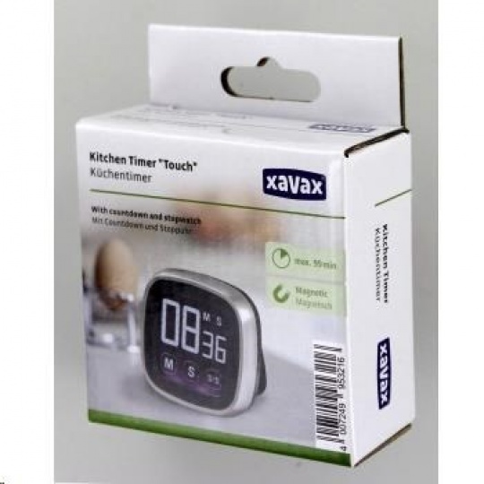 - digitální minutka se stylovým designem - nastavení času pomocí 3 dotykových tlačítek (až do 99 minut a 59 sekund) - funkce stopek a odpočítávání - tlačítko Start / Stop - hlasitý zvukový signál - velký 4-číslicový displej (XX: XX) - podsvícení - možnost postavení na vodorovnou plochu pomocí stojánku nebo připevnění na kovové magnetické povrchy pomocí magnetu - rozměry (V x D x Š): 7,2 x 7,2 x 2,4 cm - napájení: 2x Micro AAA (součást balení) - barva: černá/ stříbrná.